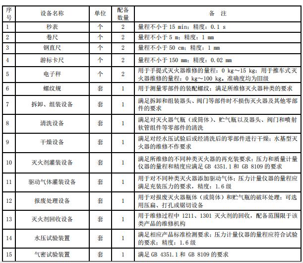 三級消防設(shè)施維護保養(yǎng)威海檢測設(shè)備用于滅火器的檢查、維修、更換滅火劑及回收,其設(shè)備配備的種類和數(shù)量至少應(yīng)滿足表 3 的要求。